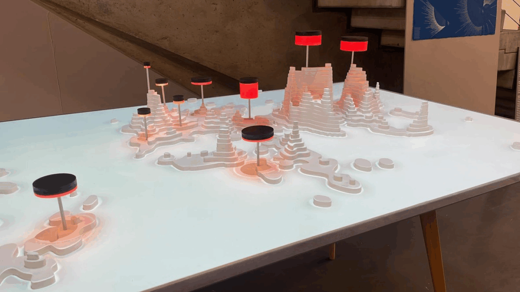 In this physical data experience, we reimagined how water stress can be visualized — not as a chart or map, but as a sculpted landscape of global population and vulnerability. By removing traditional borders and focusing purely on data, we created a tactile world where cities rise like mountains from population density, and stress flows silently beneath their peaks.